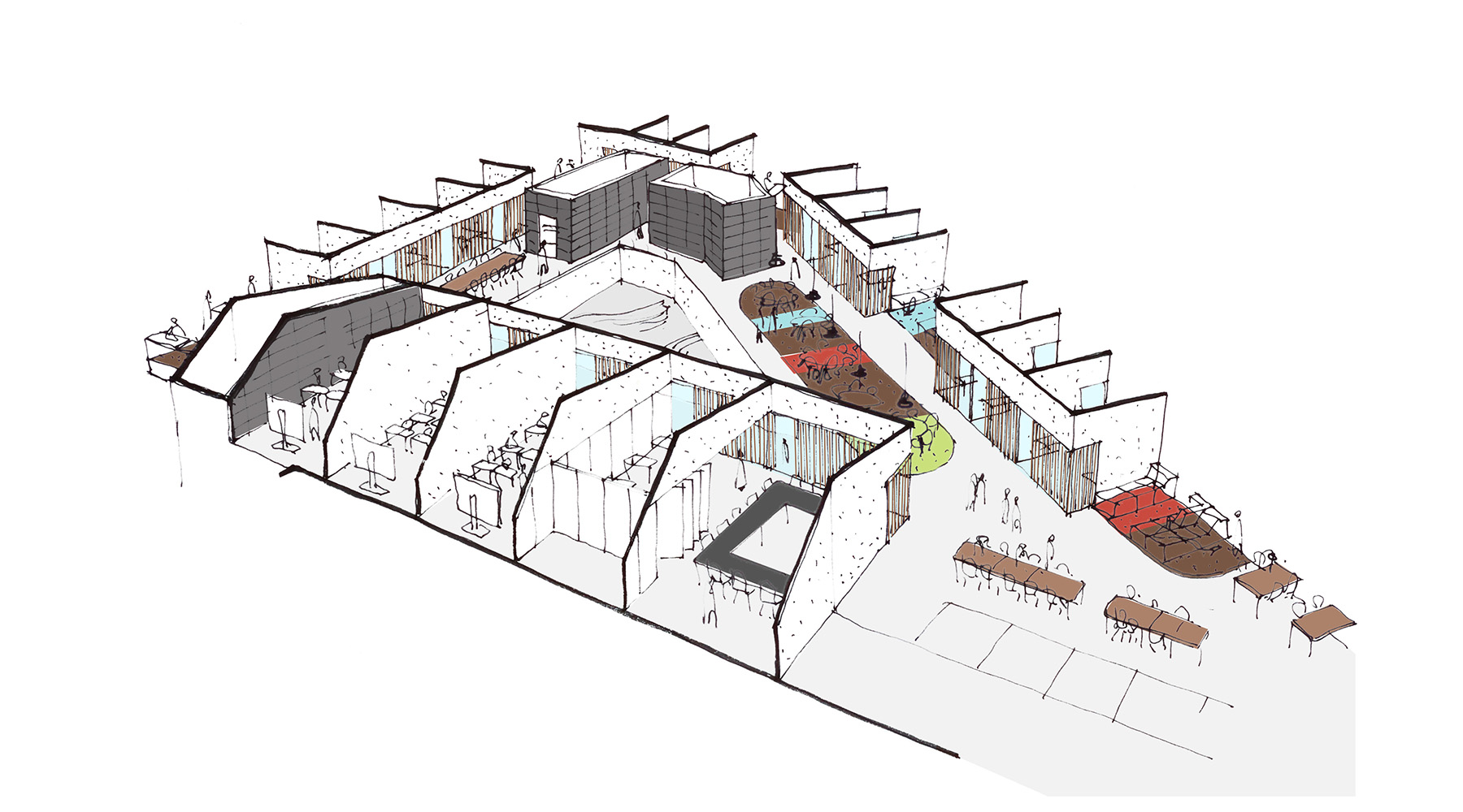 de uitwerking van lichte scheidingswanden en transparante puien ten behoeve van flexibiliteit en zichtlijnen;